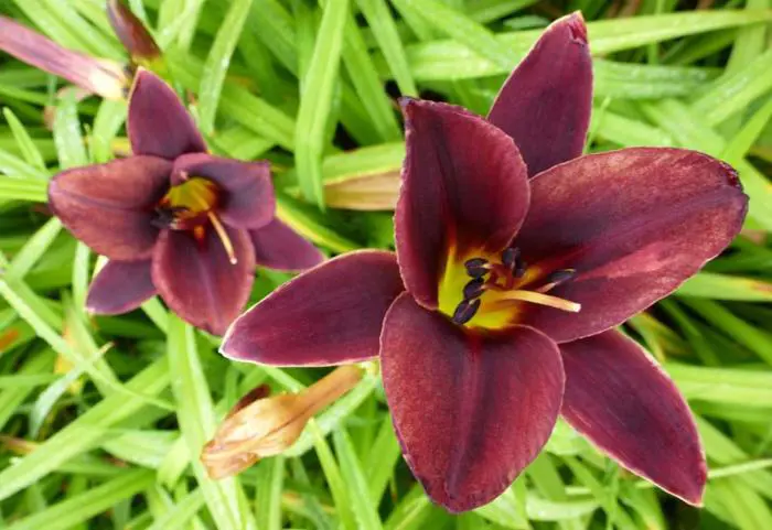 Hemerocallis 'Chocolate Candy' bloeit bruinrood met een groengele keel.
