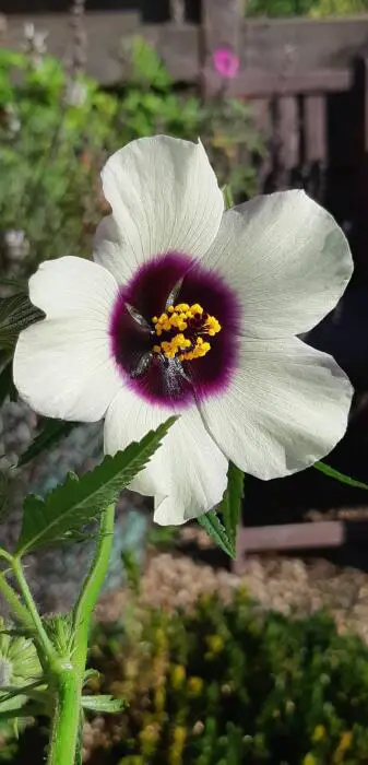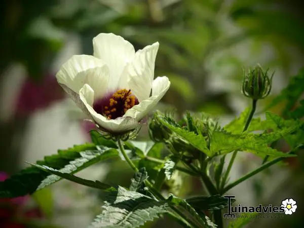 De bloem van de Hibiscus cannabinus doet denken aan Hibiscus trionum maar dan veel groter. Ook de plant wordt hoger en kan gemakkelijk de 3m halen.