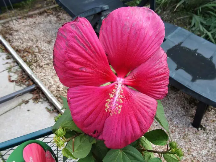 Hibiscus moscheutos 'Extreme Magenta' bloeit met magentarode bloemen.