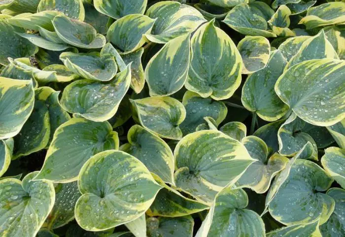 Hosta 'Aristocrat' met blauw blad waarvan de gele randen later naar cremewit verkleuren.