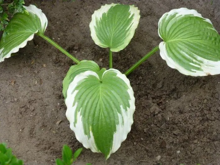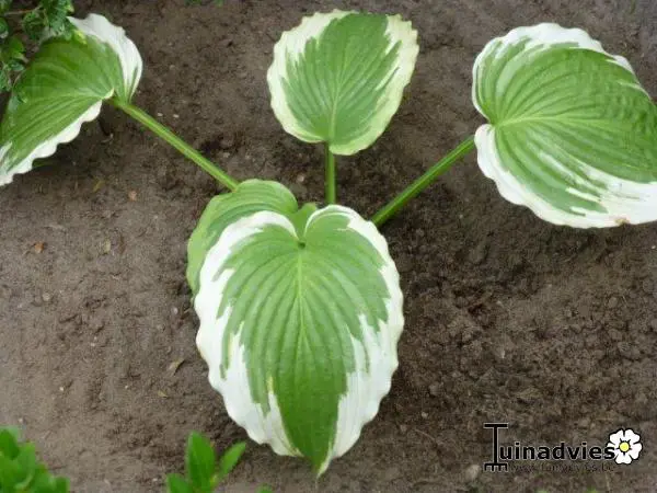 Vormt grote groene bladeren met sterk gegolfde gele randen. Het geel verkleurt later naar creme tot wit.