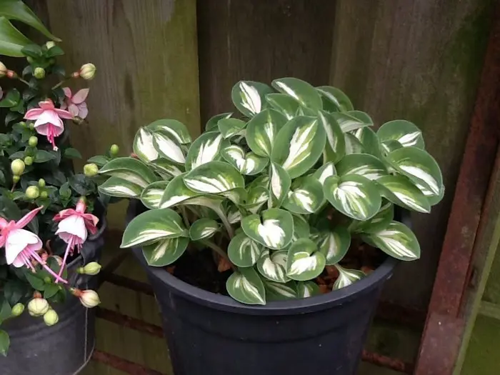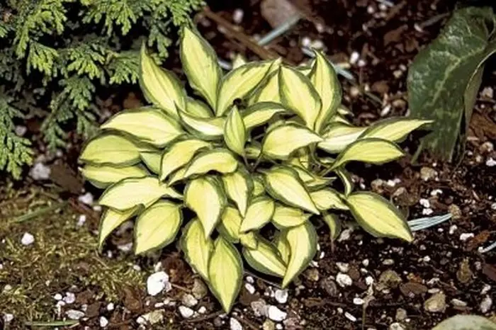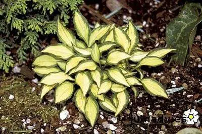 Hosta 'Cat's Eye' is een mini-hosta van het Venustatype met kleine bladeren, zachtgeel met groene rand, bloeiend met lilapaarse bloemen.