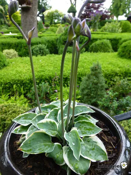 Hosta 'Country Mouse' is een mini-hosta kleine hartvormige bladeren, grijsgroen met een fijn wit randje.