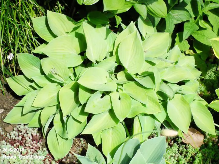 Hosta 'Gold Edger' is een snelgroeiende kleine hosta met groen naar geel verkleurende bladeren.