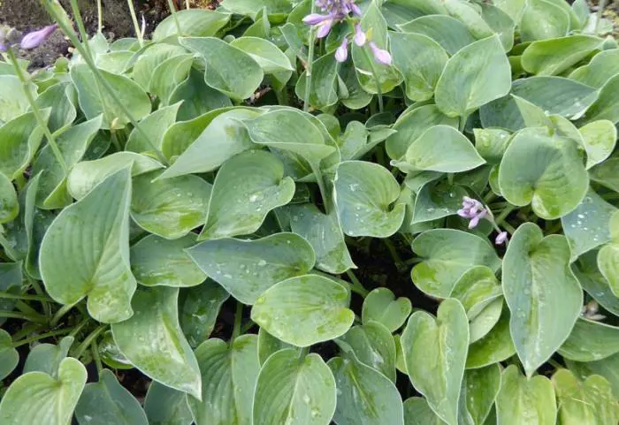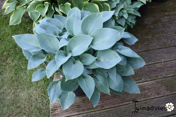Hosta 'Blue Cadet' heeft meer een rond blad, blauwgroen van kleur.