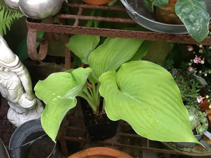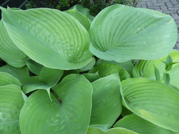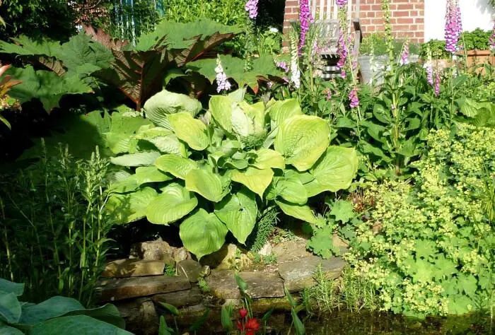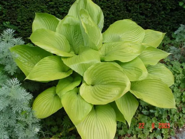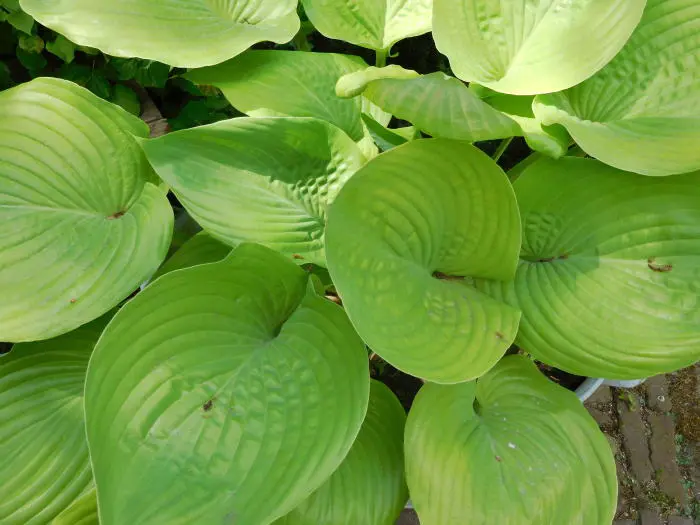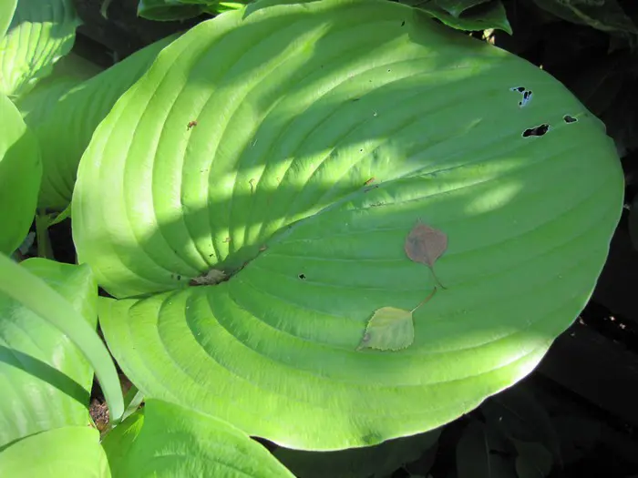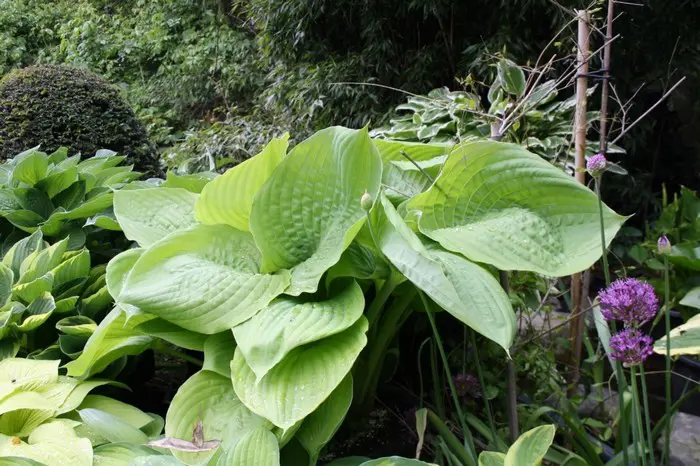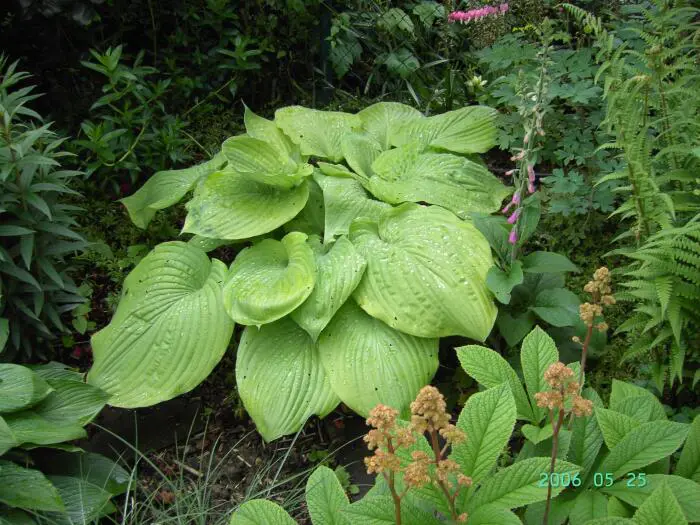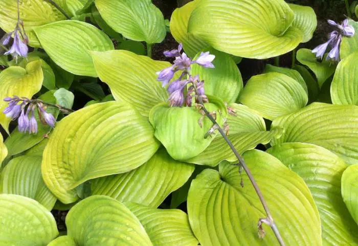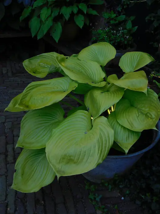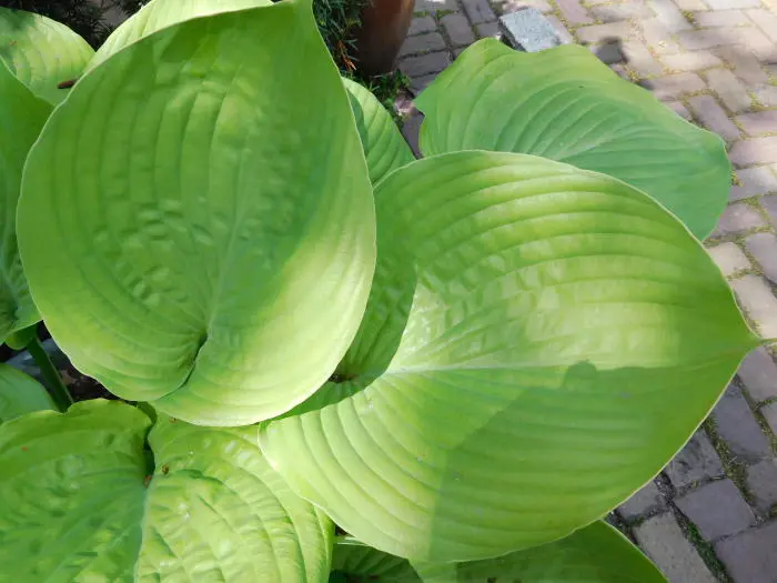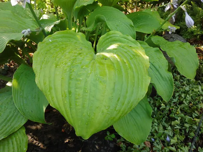 Hosta 'Sum and Substance' heeft enorm grote groengele bladeren die geler worden in volle zon.