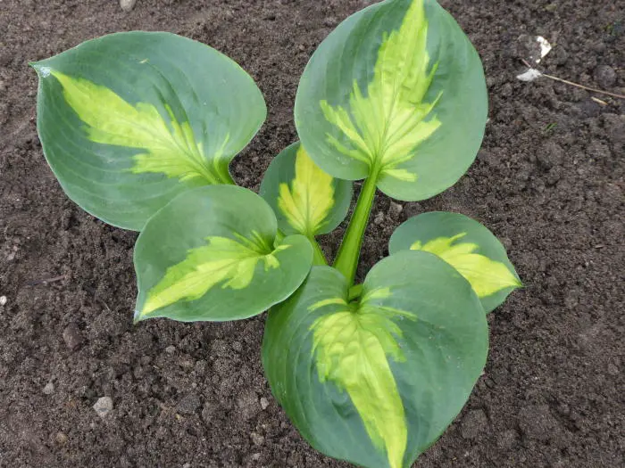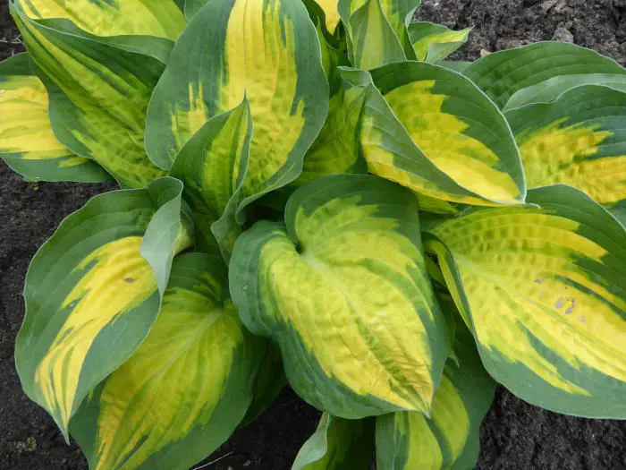 Hosta 'Sunset Grooves' heeft ronde gebobbelde gele bladeren met een brede groene rand.