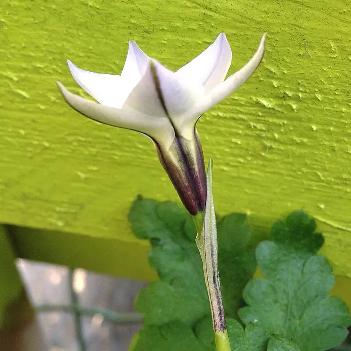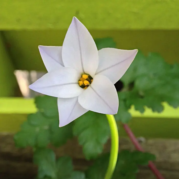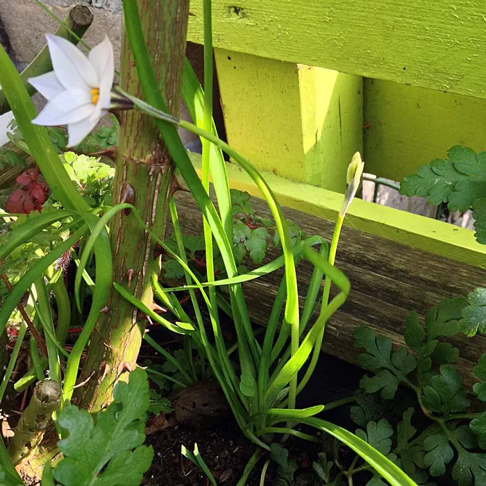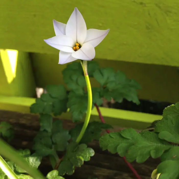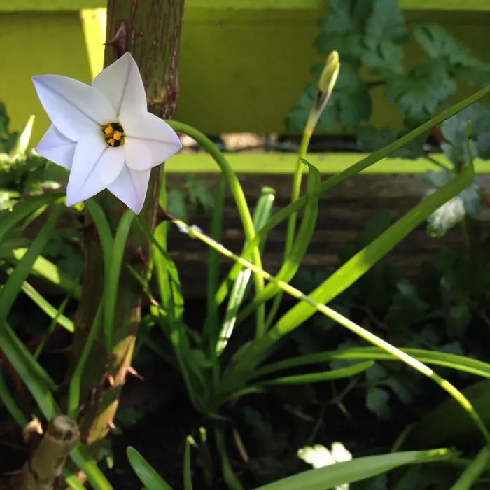 Ipheion uniflorum 'Alba' bloeit met stervormige witte bloempjes en gele meeldraden met wintergroen grasachtig blad dat mals aanvoelt.