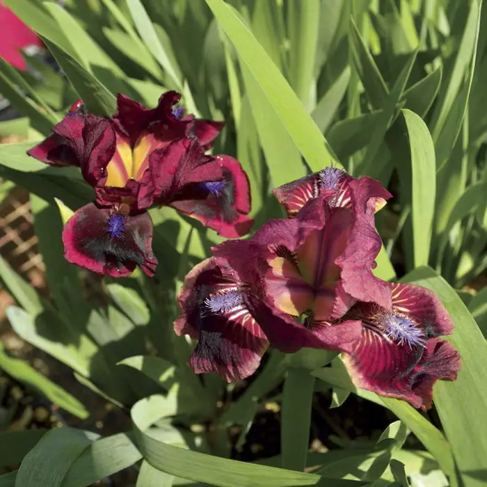Iris pumila 'Cats Eye' bloeit met prachtig getekende bloemen van rozerood aan de randen, dieper rood naar het centrum toe met een violetblauwe baard.