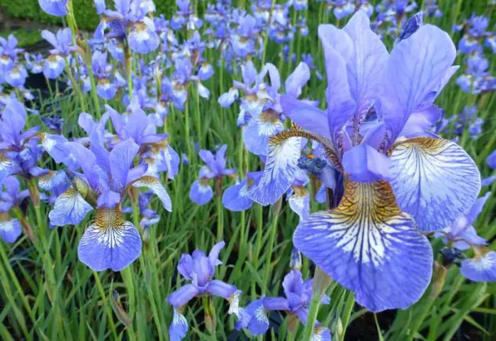 Iris sibirica 'Persimmon' met grasachtig blauwgroen blad dat tot ver in de herfst decoratief blijft.
