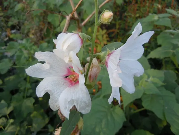 Lavatera 'Barnsley' bloeit 6/10, wit met roze oog