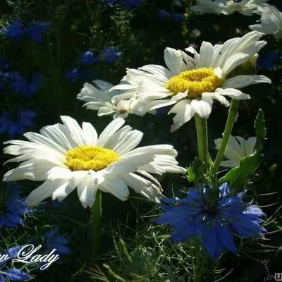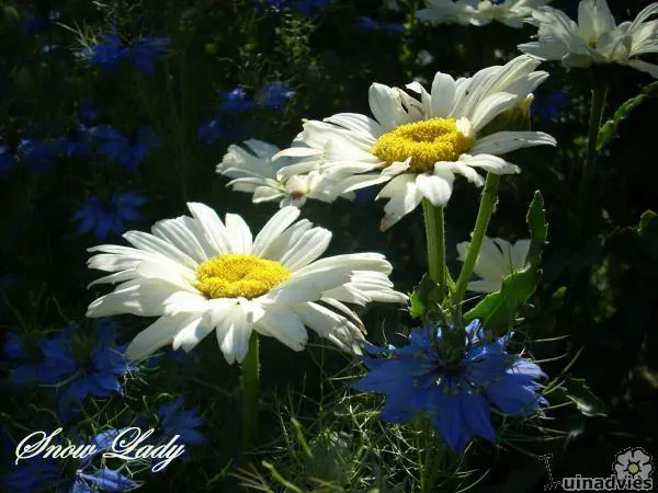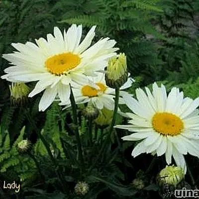 Leucanthemum x superbum 'Snow Lady' is een lage versie van de grote margriet, met een aantal grote eenvoudige witte bloemen met een geel hart ( bloem ø 6cm).
