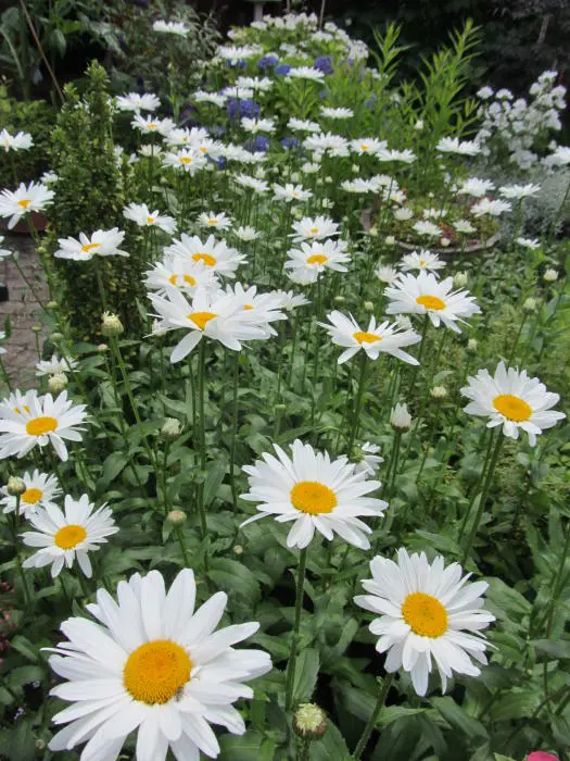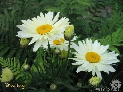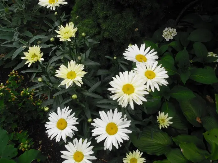 Er bestaan veel cultivars van deze bekende margriet. Het is een robuuste vaste plant met grote witte lintbloemen en een grote gele schijf in het centrum.