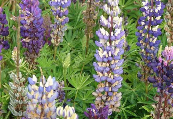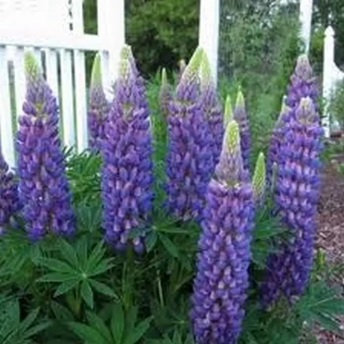 Lupinus 'GALLERY Blue' bloeit paarsblauw.