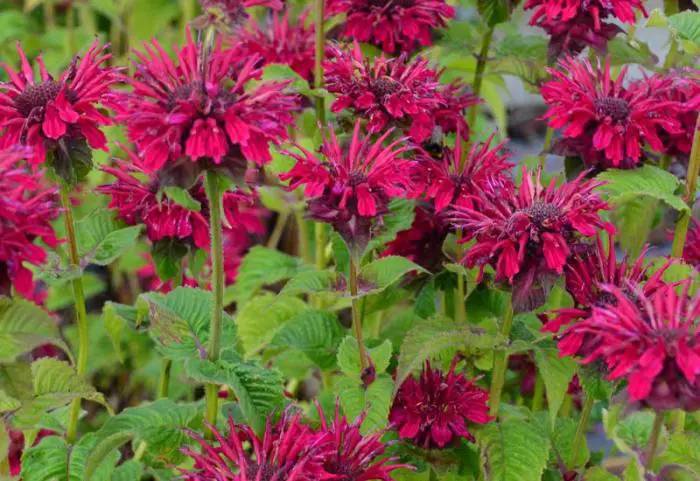 Monarda 'Fireball' bloeit met intens fluweelrode bloemen en donkere schutbladeren.