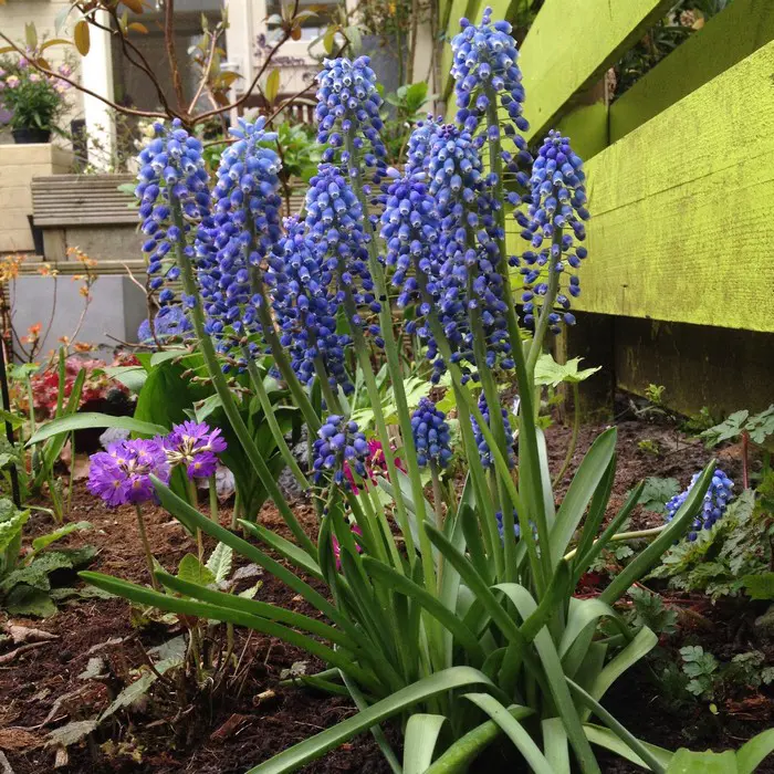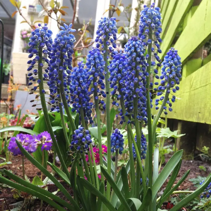 Muscari 'Big Smile' bloeit rijkelijk met langere trossen van hangende helderblauwe bloempjes met witte randje boven het kort grasachtig blad.