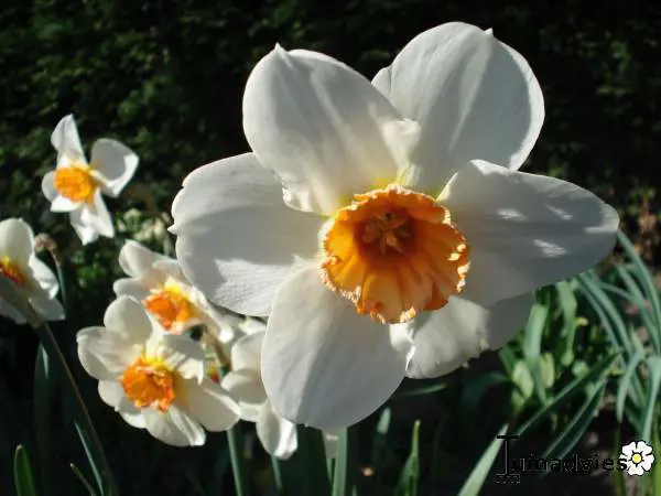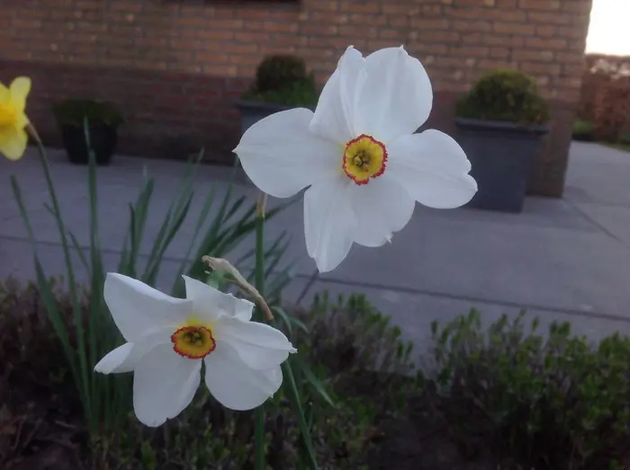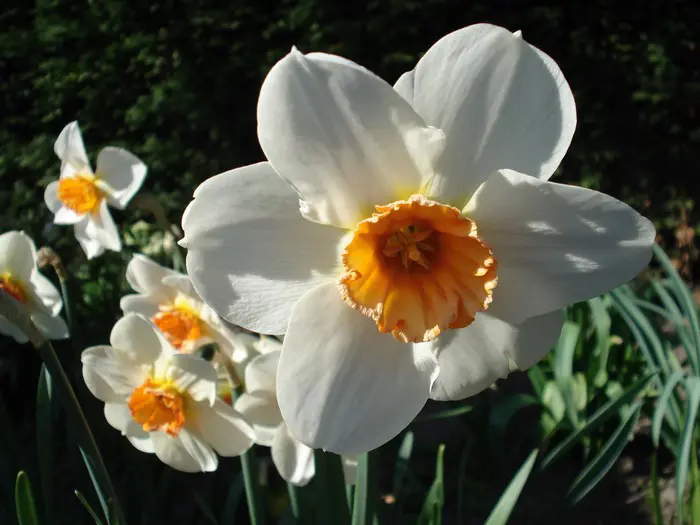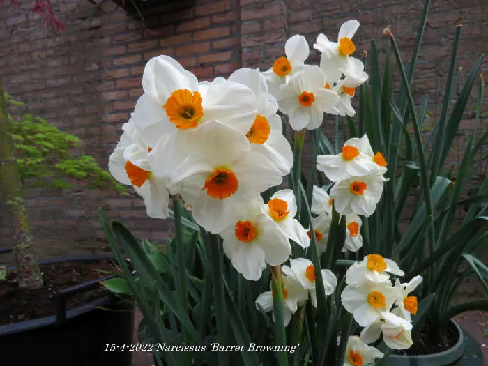 De kleinkronige Narcissus 'Barret Browning' bloeit wit met een oranje trompet.