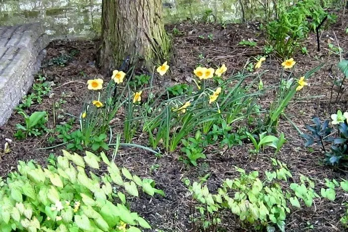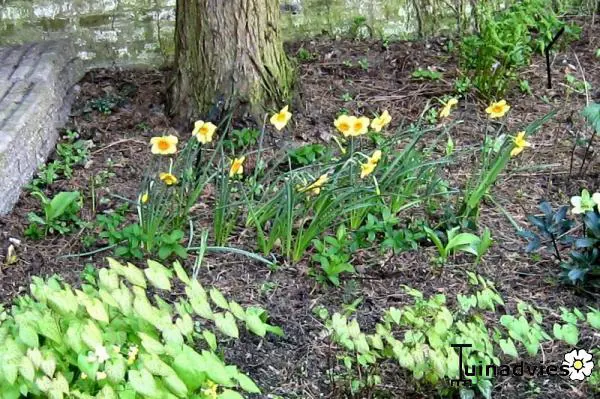 Een mini-narcis met oranjegele bloembladen en een oranje trompet.