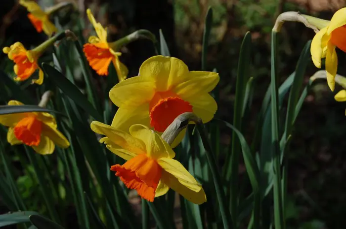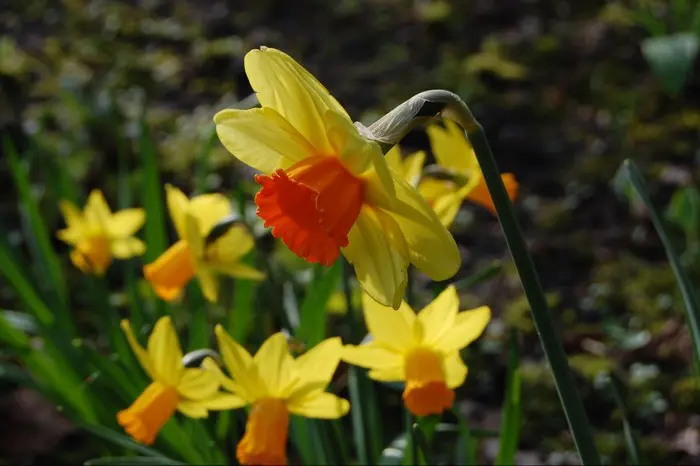Narcissus 'Monal' bloeit goudgeel met een oranje grote kroon.