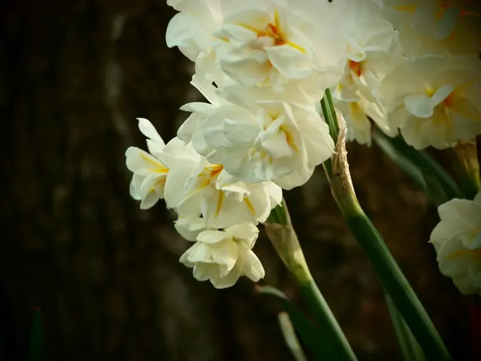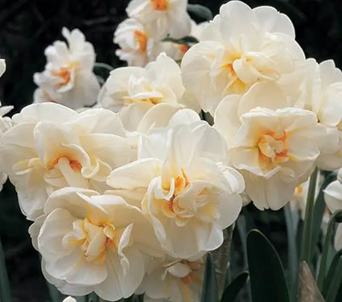 Narcissus 'Sir Winston Churchill zijn dubbelbloemige roomwitte narcissen met saffraangeel in het centrum.Per steel bloeien één of meerdere bloemen.