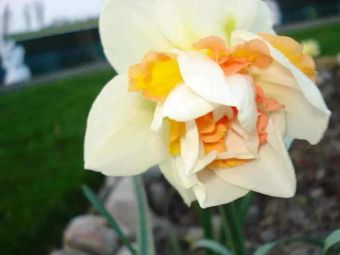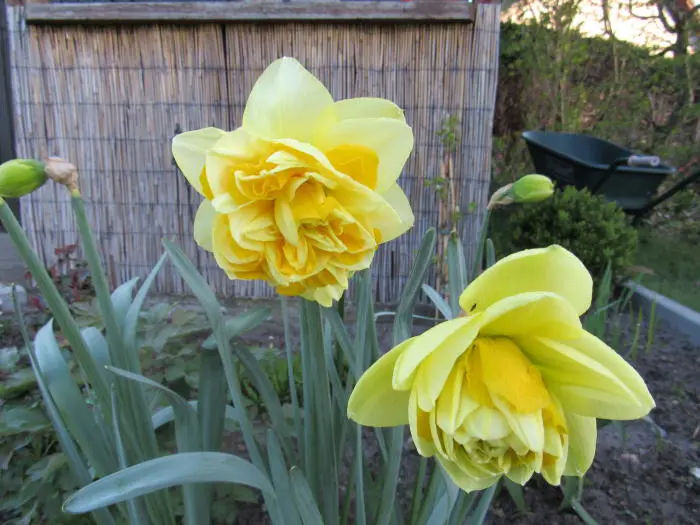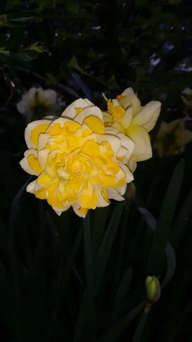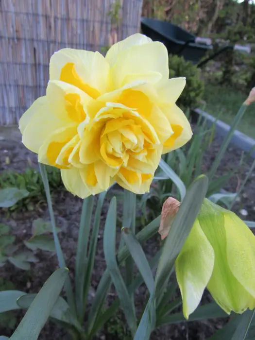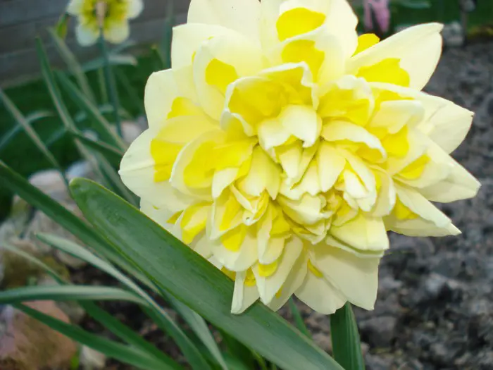 Een geurende, dubbelbloeiende narcis met citroengele en witte bloemblaadjes afwisselend in lagen.