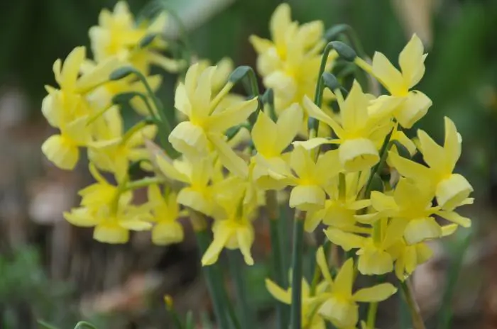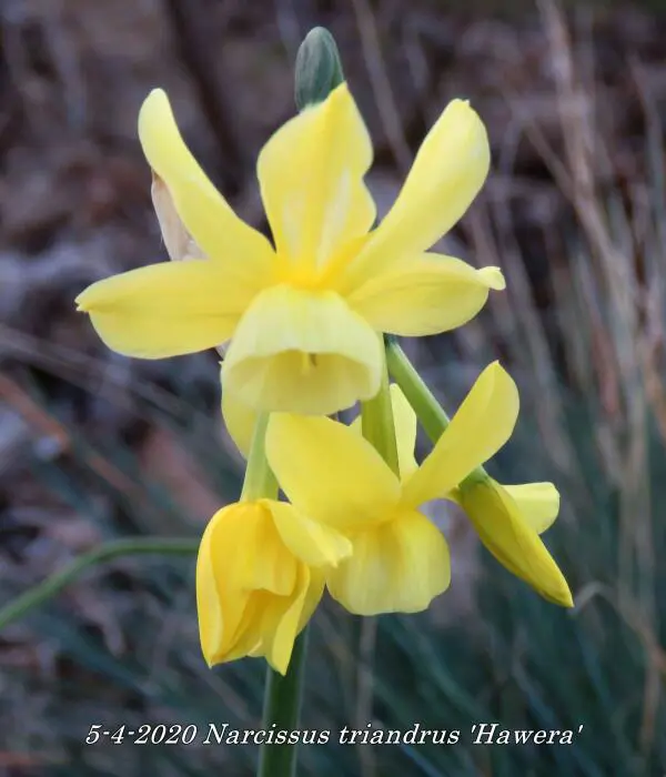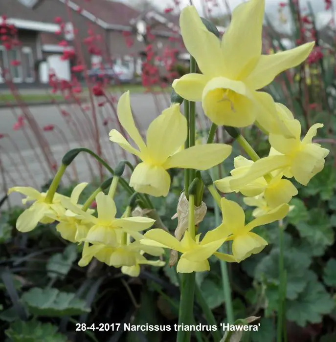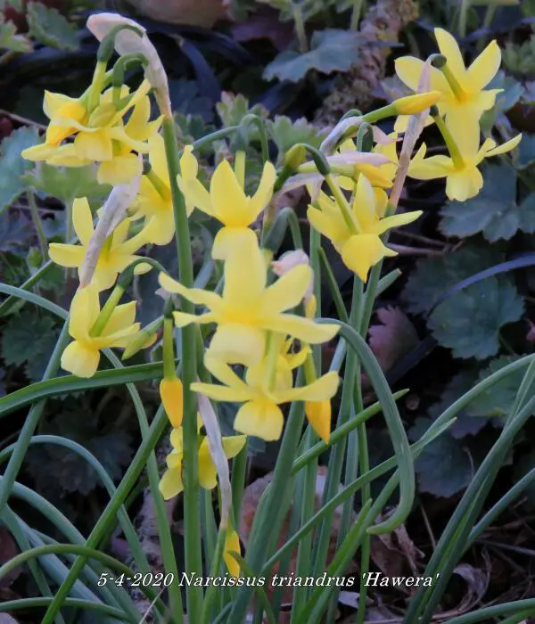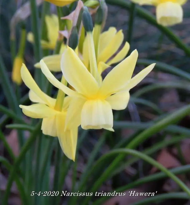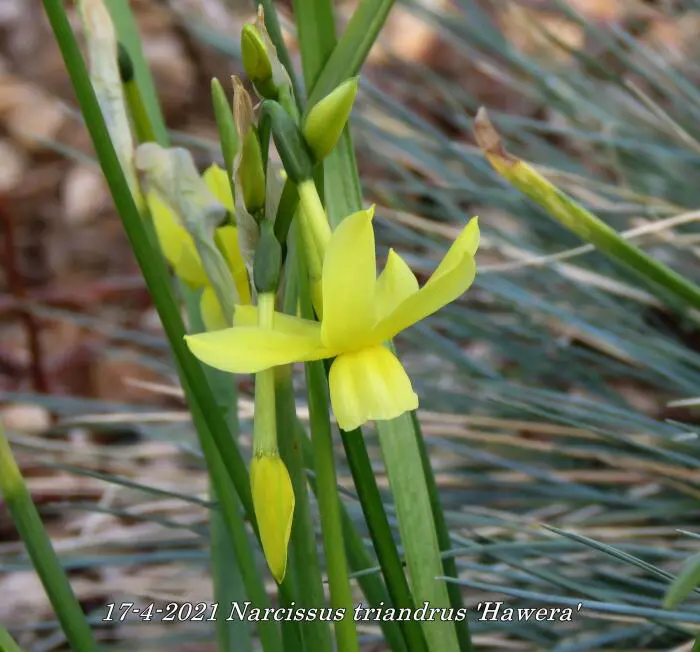 Narcissus triandrus 'Hawera' bloeit met zacht citroengele smalle bloemblaadjes en een gele kroon.