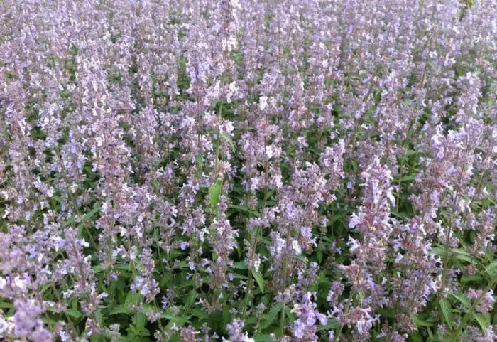 Nepeta x faassenii 'Gletschereis' bloeit met aren van zilverblauwe bloemen en heeft een klein grijsgroen blad.