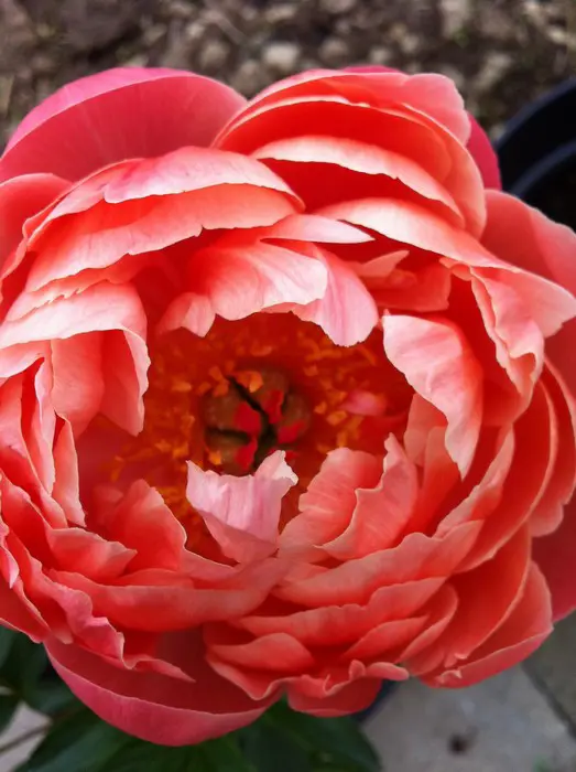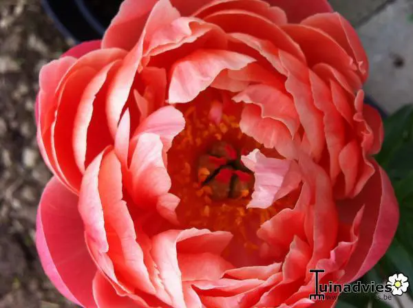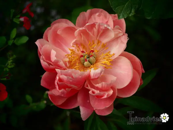 Paeonia lactiflora 'Coral Charm' bloeit met semi-dubbele koraalroze bloemen.