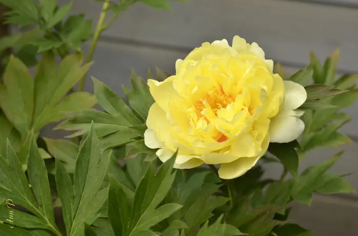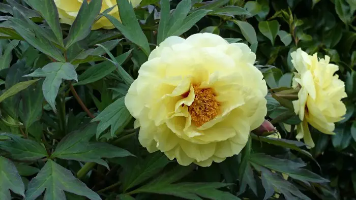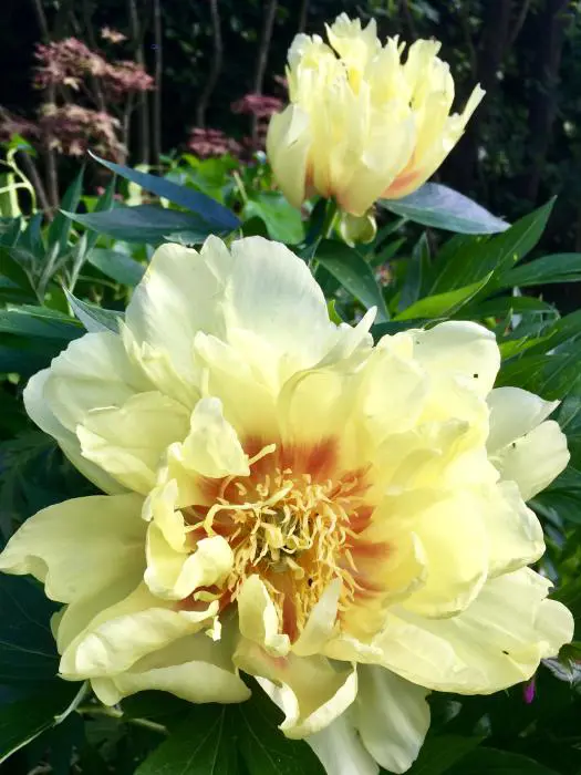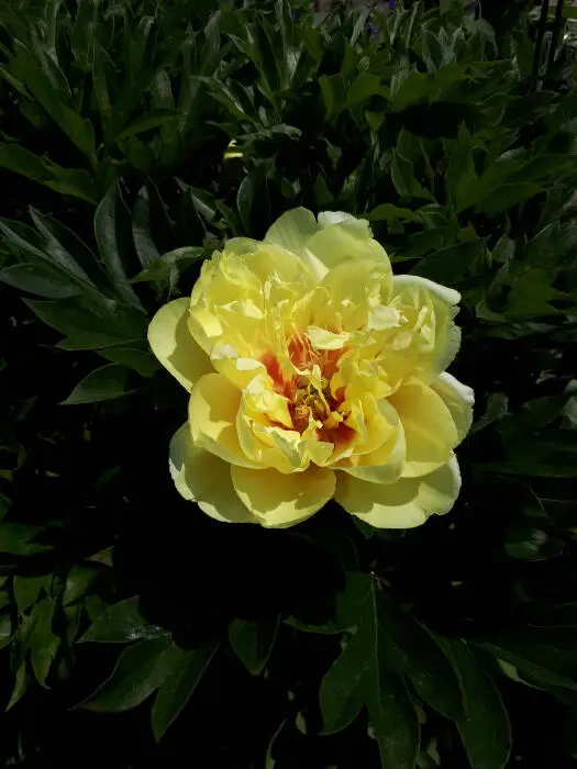 Paeonia itoh 'Bartzella' is een halfdubbele, gele pioen met in het centrum oranje vlekken.