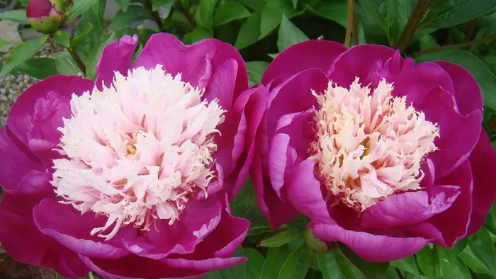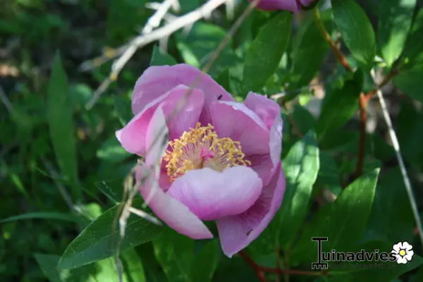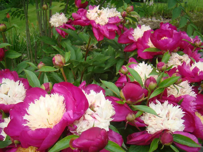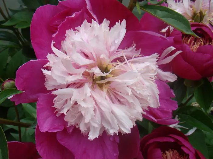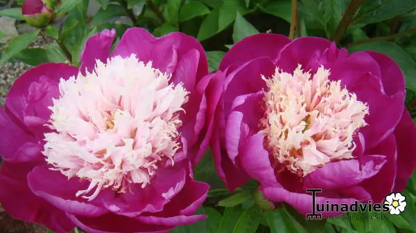 Paeonia lactiflora 'White Cap' is een tweekleurige pioen. In het midden het bleekgeel tot wit verkleurend hart met rondom bietrode bloemblaadjes.