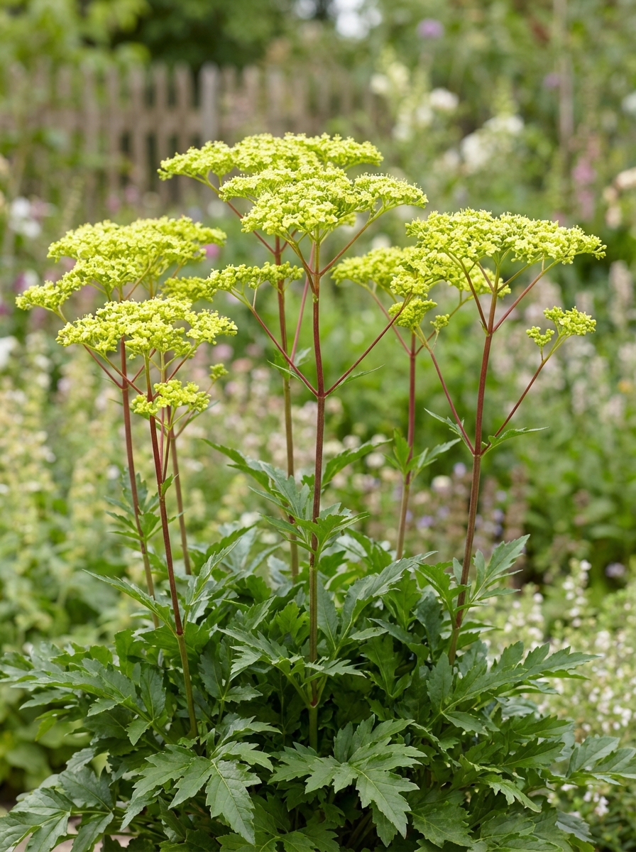 Patrinia monandra vormt grote bladrozetten met roodachtige stengels waaraan goudgele bloemschermen bloeien en die later naar meer geelgroen verbloeien.