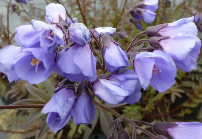 Aan de donkere stengels bloeien de trossen van grijsblauwe klokvormige bloemen.