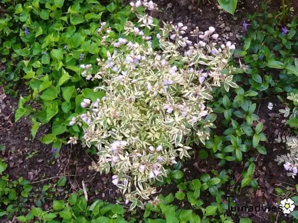 Het is een kortlevende vaste plant met een spreidende groeiwijze diep ingesneden bladeren die doen denken aan varens. Het blad is bont gekleurd, groene met cremwitte randen tot roze in het voorjaar.