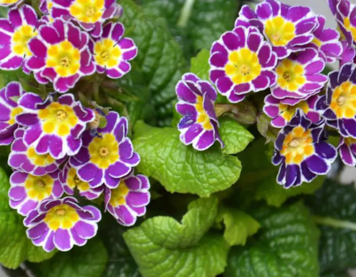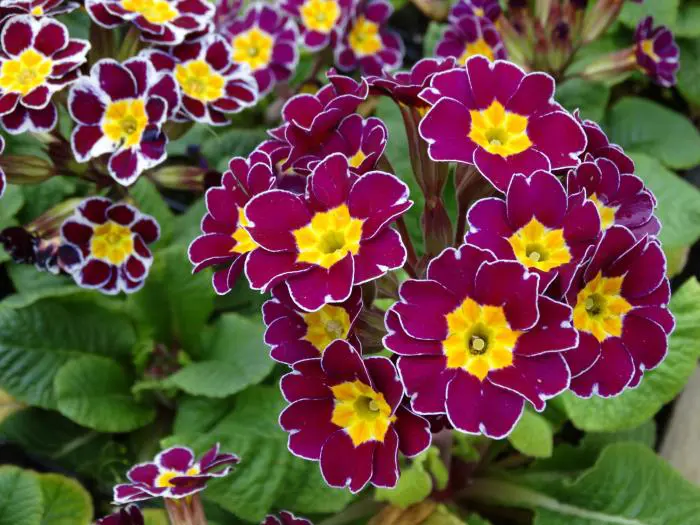 Primula elatior 'Silver Lace Purple' bloeit met opvallende bloemen. De paarse bloemblaadjes hebben een zilver randje en zijn aan de basis, in het midden geel gekleurd.