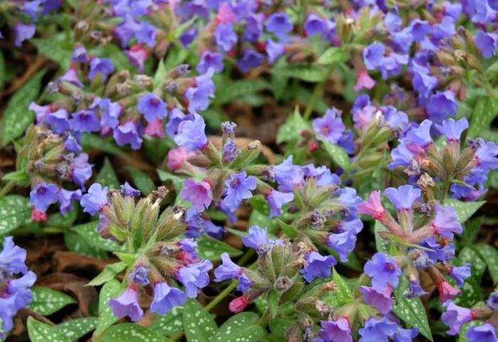 Pulmonaria 'Trevi Fountain' heeft prachtig zilverwit gevlekt, groen blad en bloeit weelderig met kobaltblauwe bloemen.