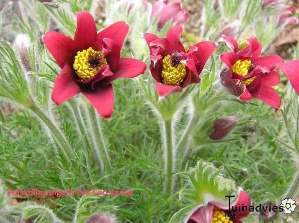 Pulsatilla vulgaris 'Eva Constance' bloeit in maart/april, 15cm hoog en nà de bloei wordt hij 40cm met ronde behaarde pluimvormige zaadhoofdjes.