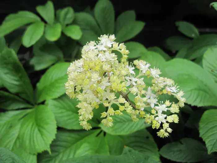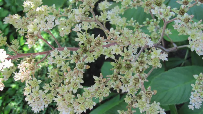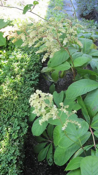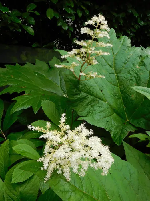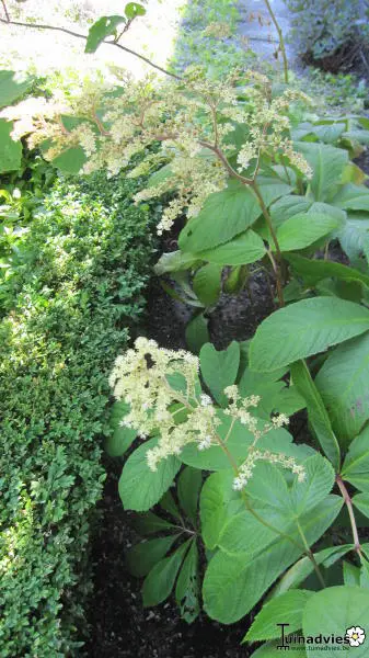 Rodgersia 'La Blanche' is een hybride, een van de meest elegante en architectonische van het geslacht met zijn bossige groeiwijze en zijn handvormig en glanzend groen kastanjeblad, getint met oranjerood in de herfst.