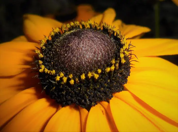 Bloeit met geeloranje bloemen waarvan de bloemblaadjes meer oranje tot roodbruin kleuren rond de donkerbruine kegel..