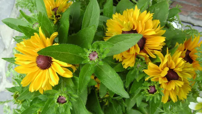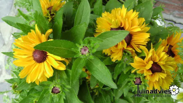 Rudbeckia hirta 'Tiger Eye Gold' is een lage cultivar met vertakte bloemstengels waarop de semi-dubbele goudgele bloemen bloeien.