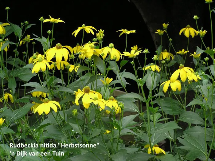 Rudbeckia nitida 'Herbstsonne' is een sterke vaste plant van 150-200cm dat een must in de tuin is omwille van zijn lange goudgele bloei met grote bloemhoofden dat 2 maanden duurt. De bloemblaadjes zijn iets afhangend rond een donkerbruine kegel.