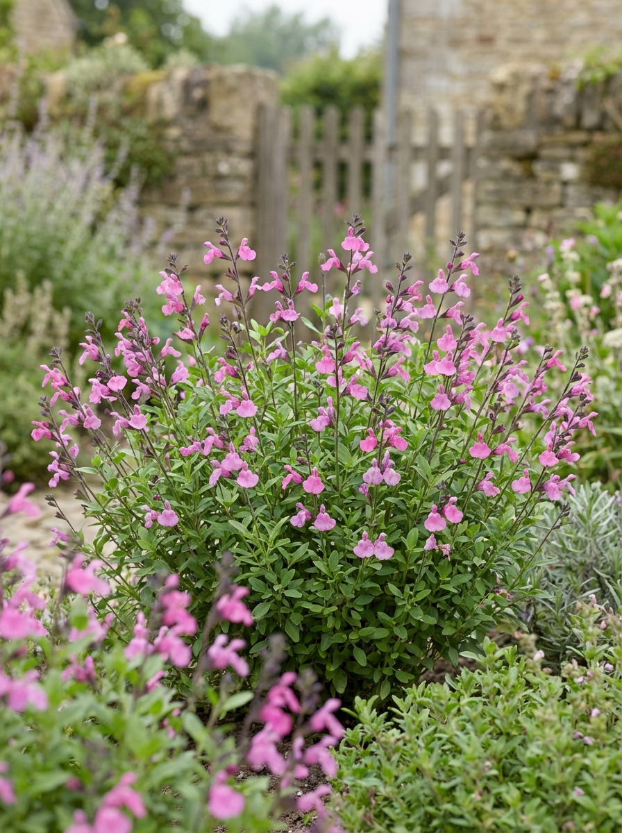 Salvia 'Flower Child' is een compacte en dicht vertakte plant met grote suikerroze bloemen.