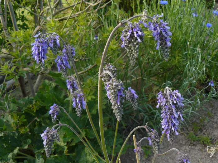 Aan hoge bladloze stengels hangen de violetblauwe aren sierlijk naar beneden.