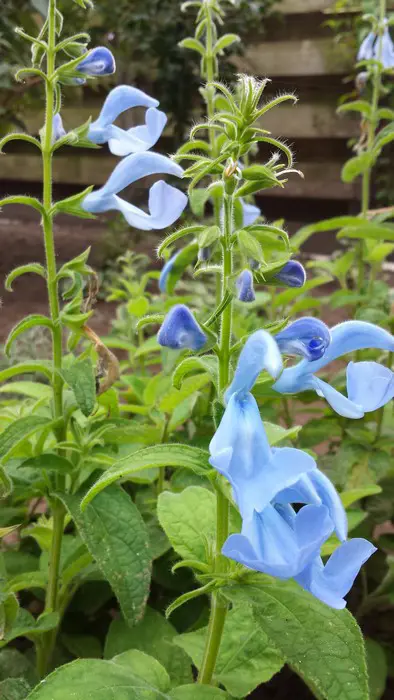 De helder hemelsblauwe bloemen zijn vrij groot vergeleken met de meeste andere salie. Ze staan paarsgewijs langs de stengel opgesteld.