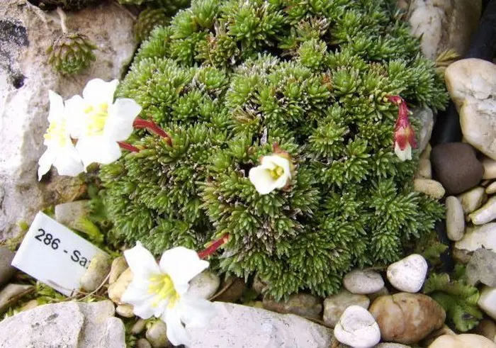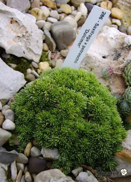 Saxifraga x petraschii 'Dulcimer' vormt een kussen van kleine rozetten van grijsgroene naaldbladeren. Bloeit met grote witte bloemen op roodachtige stengels.