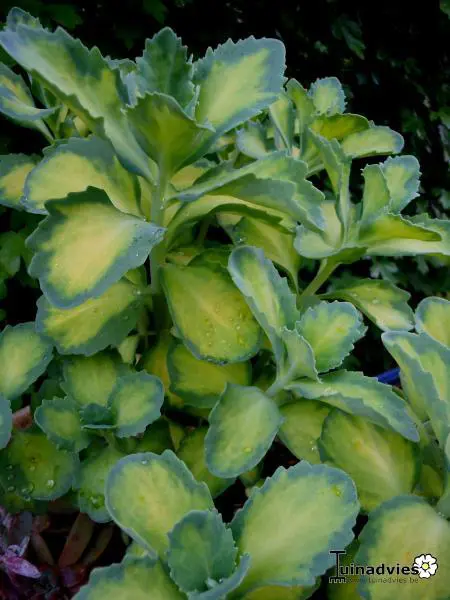 Sedum alboroseum 'Mediovariegatum' vormt een pol van dikke rechte stengels met dikke vlezige, ovale getande bladeren. Een blauwgroene bladkleur met onregelmatige cremegele vlekken.