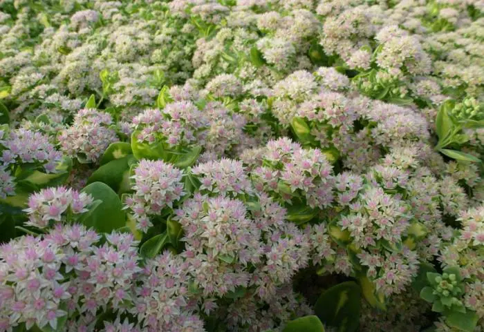 De groenachtige bloemschermen kleuren in de nazomer bleekroze.