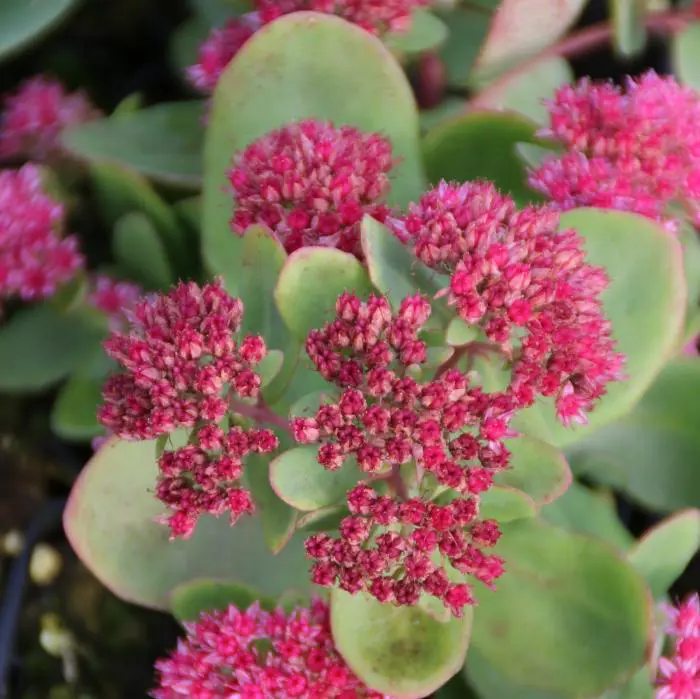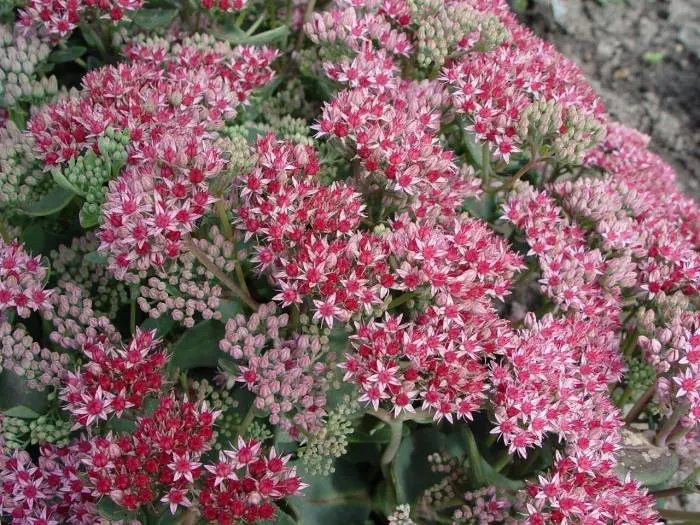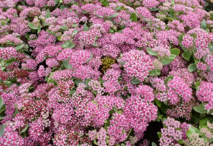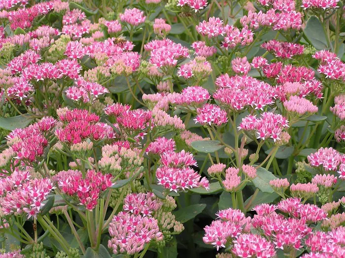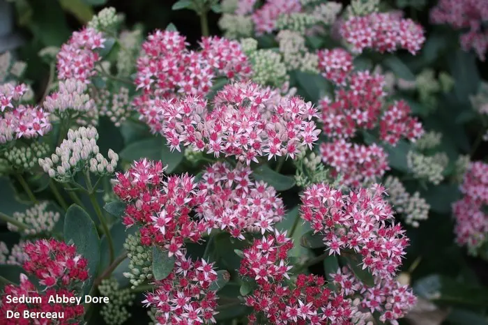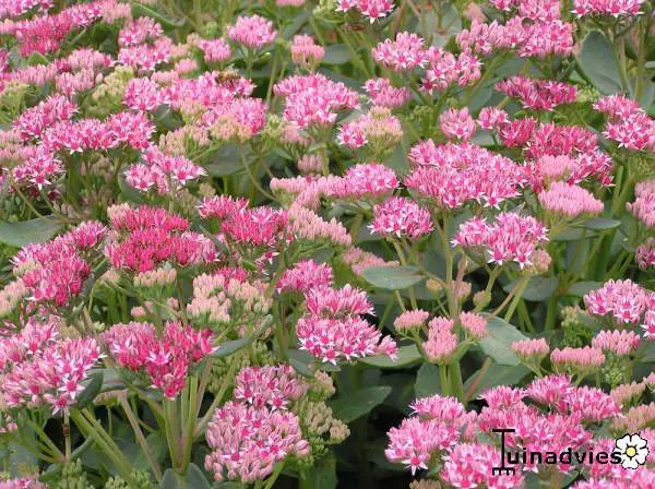 Sedum 'Abbeydore' bloeit lichtroze met later de vruchtbeginsels die donkerrood worden, dit geeft een erg mooi effect.
