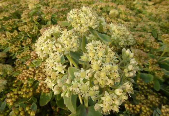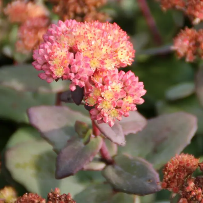 Sedum 'Yellow Xenox' heeft grijspaarse vlezige blaadjes en bloeit met roomgele/roze bloempjes.