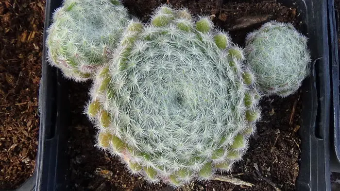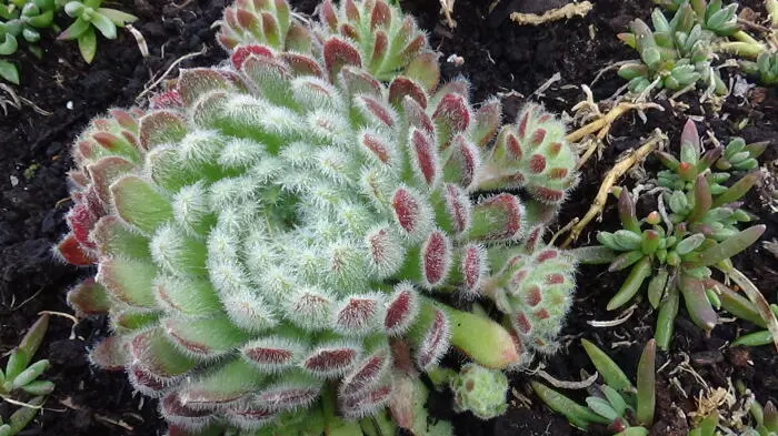 Sempervivum Arachnoideum 'Cebenese' vormt een dicht kussen van vlezige rozetten met driehoekige groene blaadjes waarvan de bladuiteinden bordeauxrood kleuren, bedekt met een fijne spinnenweb van zilverwitte haartjes. De rode kleur wordt intenser in de zon of onder invloed van een lage temperatuur.