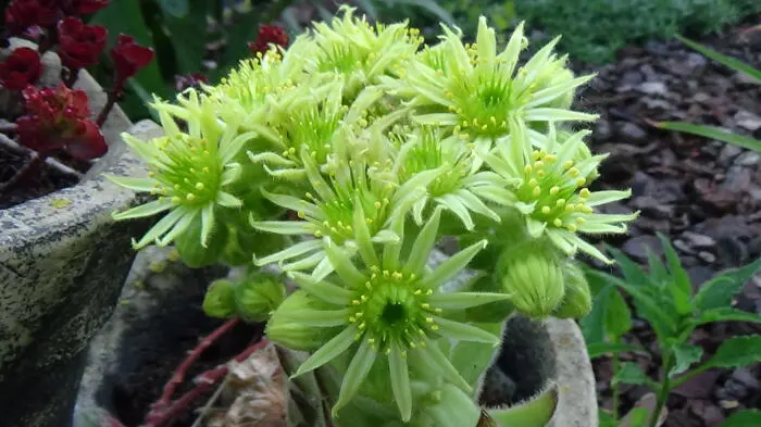 Bloeit aan een hoge stengel (10cm) met stervormige fel roodroze bloempjes. Na de bloei sterven de rozetten af maar worden vervangen door nieuwe uitlopers.